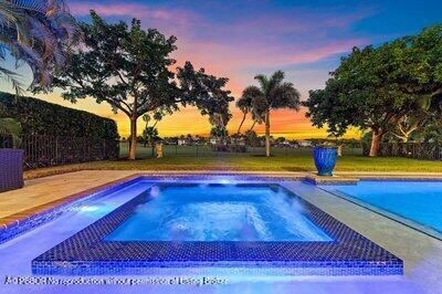 Jupiter Country Club living at its finest! This Castania model is set on an oversized lot and was customized for larger guest bedrooms, along with many other upgrades. This 4 bed 4 bath plus office, triple split floor plan has polished marble floors, solid core doors, upgraded kitchen, custom pool with hot tub and sun shelf, built in summer kitchen, enormous patio, and a backyard located on the 16th hole. Enjoy expansive golf views from almost anywhere in the house.