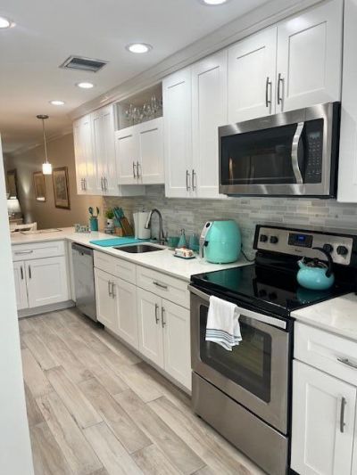 WELCOME HOME TO A BEAUTIFULLY FULLY REMODELED FIRST FLOOR FULLY FURNISHED 2-2 VILLA WITH A REAR PORCH and GARDEN VIEW. This home is freshly painted and impeccably decorated down to the silverware to transport you into coastal vibes. Only 3 minutes from Atlantic Ave Downtown area & Restaurants and 10 minutes to beach! High end stainless steel kitchen appliances with new white cabinets and custom Quartz wrap around counter tops, new sink and faucet,high hats, pendant lights and enclosed stacked ...WELCOME HOME TO A BEAUTIFULLY FULLY REMODELED FIRST FLOOR FULLY FURNISHED 2-2 VILLA WITH A REAR PORCH and GARDEN VIEW. This home is freshly painted and impeccably decorated down to the silverware to transport you into coastal vibes. Only 3 minutes from Atlantic Ave Downtown area & Restaurants and 10 minutes to beach! High end stainless steel kitchen appliances with new white cabinets and custom Quartz wrap around counter tops, new sink and faucet,high hats, pendant lights and enclosed stacked w/d. Wood tile floors throughout. Back door entry to screened and shuttered patio & big backyard with Mango tree. Located across the street from Clubhouse 2 and tennis. Light, bright and ready for immediate occupancy. Delray Beach is the place to be!