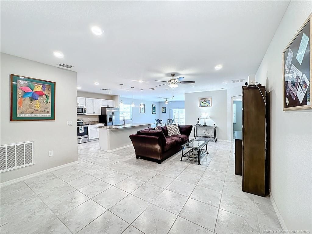 Move-in-ready Florida single-family home featuring an open floor plan, split-bedroom layout, and fully fenced backyard with room for a pool and/or lanai. Open kitchen offers granite countertops, center island, stainless steel appliances, pantry, and flows into the great room and dining area. Tile flooring in main living areas and abundant natural light throughout. The primary suite includes a walk-in closet and en-suite bath with dual-sink granite vanity and walk-in tiled shower. Three additiona...Move-in-ready Florida single-family home featuring an open floor plan, split-bedroom layout, and fully fenced backyard with room for a pool and/or lanai. Open kitchen offers granite countertops, center island, stainless steel appliances, pantry, and flows into the great room and dining area. Tile flooring in main living areas and abundant natural light throughout. The primary suite includes a walk-in closet and en-suite bath with dual-sink granite vanity and walk-in tiled shower. Three additional bedrooms provide flexible living space. Additional features include an interior laundry room, two-car garage, and spacious backyard. Centrally located near shopping, restaurants, hospitals, beaches, NY Mets Spring Training complex, and convenient to the Florida Turnpike and I-95. A great opportunity to own a well-located home with space, comfort, and outdoor potential