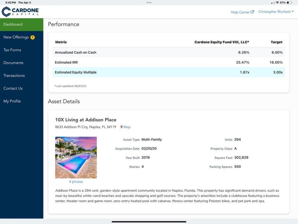 What you are buying is the fund with all the upside plus monthly distributions this portfolio has 8 funds and 18 class A multifamily properties. fractional share distributions. All funds throw-off different amounts and they all have different cap rates. Please reach out for more details. We are selling our equity shares. Take advantage of an already proven and secure investment.The fund is co-invested in the property with Cardone REIT.Call for information on the rest of the properties and see at...What you are buying is the fund with all the upside plus monthly distributions this portfolio has 8 funds and 18 class A multifamily properties. fractional share distributions. All funds throw-off different amounts and they all have different cap rates. Please reach out for more details. We are selling our equity shares. Take advantage of an already proven and secure investment.The fund is co-invested in the property with Cardone REIT.Call for information on the rest of the properties and see attached photos with summaries. The big deal here is the monies have been invested on average 6-7 years.