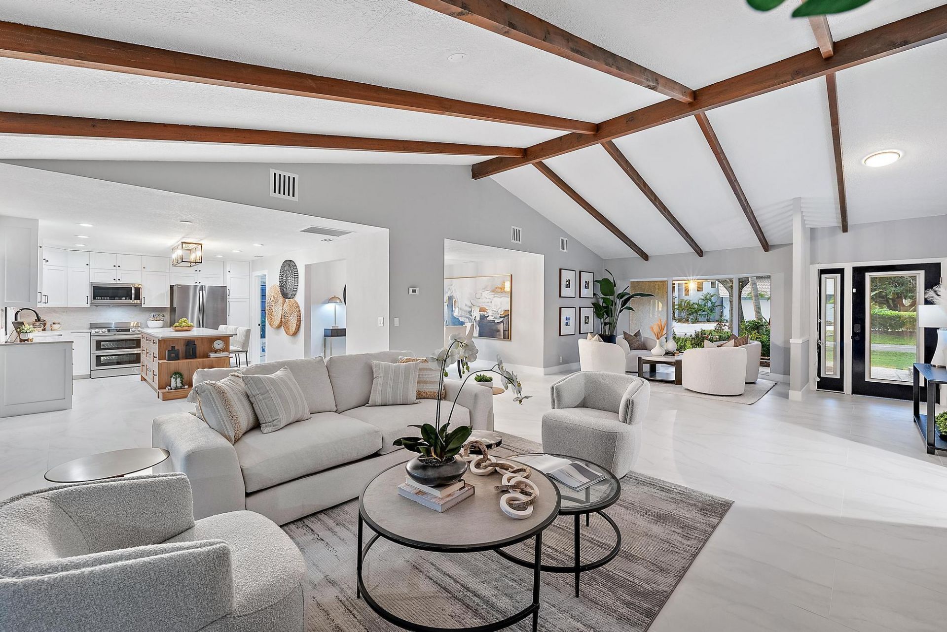 Located in the highly sought-after PGA National, this spacious 3-bedroom, 2-bathroom residence sits on a rarely available .30-acre lot and offers over 2,100 sq. ft. of beautifully upgraded living space. Complete with brand-new 2025 impact windows, this home blends modern luxury with true South Florida indoor/outdoor living.Step inside to vaulted ceilings, exposed beams, and new 24'' x 48'' Andover White porcelain tile flooring with a matte finish throughout the main living areas. Multiple slider...Located in the highly sought-after PGA National, this spacious 3-bedroom, 2-bathroom residence sits on a rarely available .30-acre lot and offers over 2,100 sq. ft. of beautifully upgraded living space. Complete with brand-new 2025 impact windows, this home blends modern luxury with true South Florida indoor/outdoor living.Step inside to vaulted ceilings, exposed beams, and new 24'' x 48'' Andover White porcelain tile flooring with a matte finish throughout the main living areas. Multiple sliders open fully to a large screened lanai, creating a seamless flow between the indoor and outdoor spaces. The newly renovated kitchen features timeless white cabinetry, an oversized wood-toned island, new 3cm Pompeii Cassandra quartz countertops and backsplash, designer lighting, under-cabinet lighting, new appliances, and a sliding pass-through window ideal for outdoor dining or serving. The designer-remodeled guest bathroom features Bedrosians tile, 5"x5" Cloe collection subway tile and the hexagon mosiac on the back of the niche was the perfect choice to pull in the matching Bianco Orion Polished Hexagon Marble Floor. The expanded primary suite includes dual custom walk-in closets and private access to the pool. The primary bathroom is a showpiece with fluted Carrara marble wall tile, a seamless envelope-cut shower pan, large-format Bedrosians tile, a Rialto Grand porcelain floor, oversized frameless glass shower doors, and a luxury 72" double vanity with a wood oak base. Situated on an oversized lot, the home includes over $15,000 of new front and backyard landscaping, 12-ft privacy hedges, tropical fruit trees (mango, banana, lime), smart exterior lighting, and a spacious fully fenced yard. The large screened lanai features a heated saltwater pool, new patio tile, covered outdoor seating with two fans, and plenty of room to relax or entertain. Interior and Mechanical Features: Fresh interior paint (2025) New induction stove/oven (2024) and refrigerator (2025) Bedroom AC (2025) | Living room AC (2017) with UV purification systems Hybrid hot water heater (2020) Ring alarm system Impact-rated front door, garage door, side garage door & bay window Armor Screen protection for rear patio Two electric vehicle charging hookups Pool & Outdoor Upgrades: Heated pool with 10-year liner (2021) Wi-Fi-enabled pool pump (2022) Saltwater system (2021) Fully fenced, private backyard Residents enjoy optional membership, giving flexibility to join or simply enjoy the lifestyle. PGA National offers five championship golf courses, world-class tennis and pickleball, a luxury spa (open to the public), resort pools, and seven on-site restaurants including The Butcher's Club. Minutes from Palm Beach International Airport, I-95, and the Florida Turnpike. Close to North County District Park (recent host of Real Madrid training), pristine beaches, Downtown West Palm Beach, top dining, and the Brightline high-speed rail to Miami and Orlando.